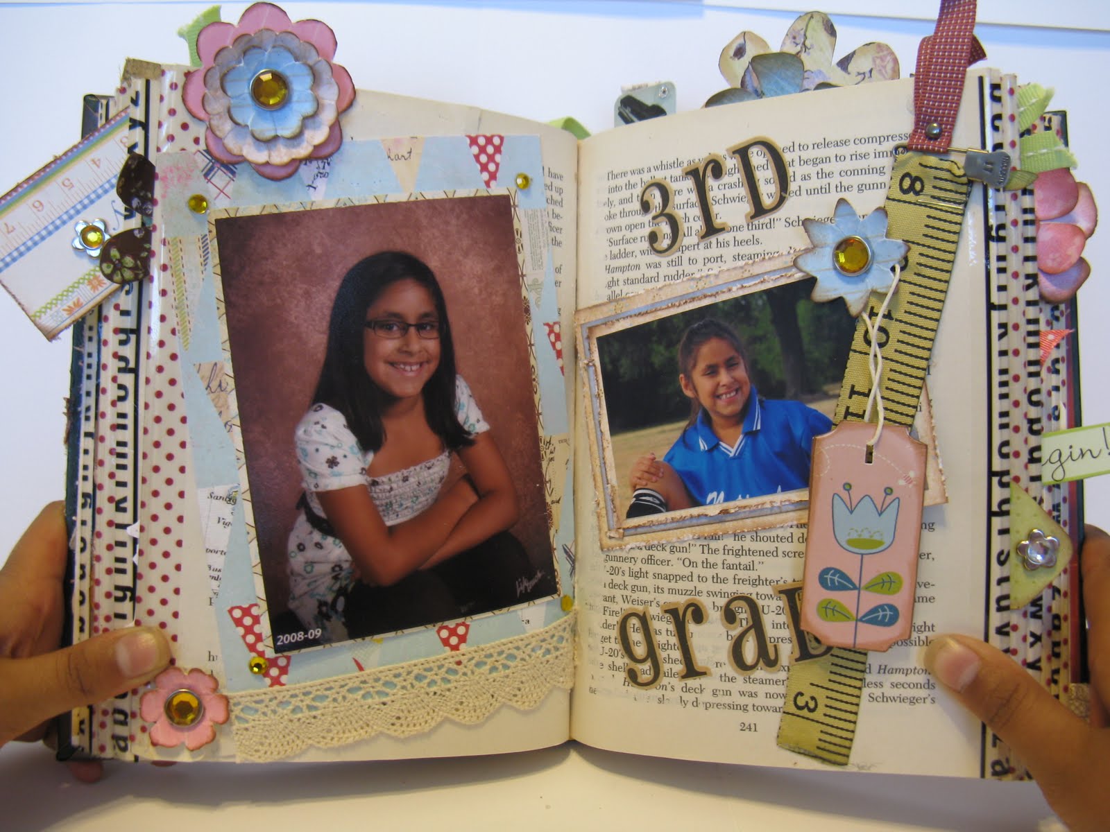 Altered books and flowers are truly one of my favorite things to make. This book was focused on school. What a great way to show your childs development over the years. I hope you try making an altered book yourself. Send me a note if you do.